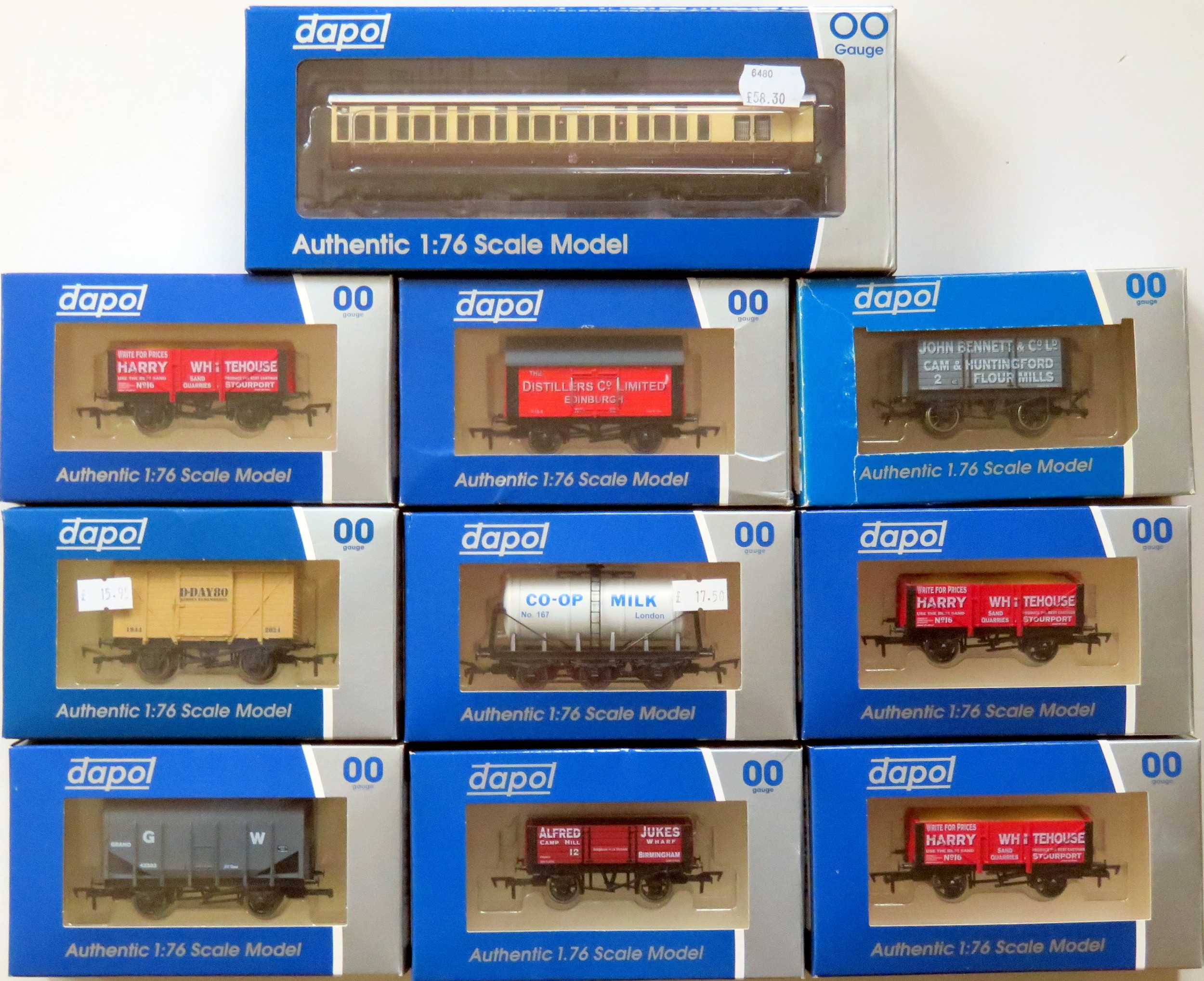 DAPOL 00 Gauge 10 x Rolling Stock comprising: 4P-02-201 GWR Toplight Coach with interior lighting and tail lamp, plus 9 x assorted Goods Wagons to include Hopper Wagon, Private Owner, Tanker plus others. Mostly Excellent to Near Mint in Excellent Boxes (10)