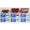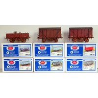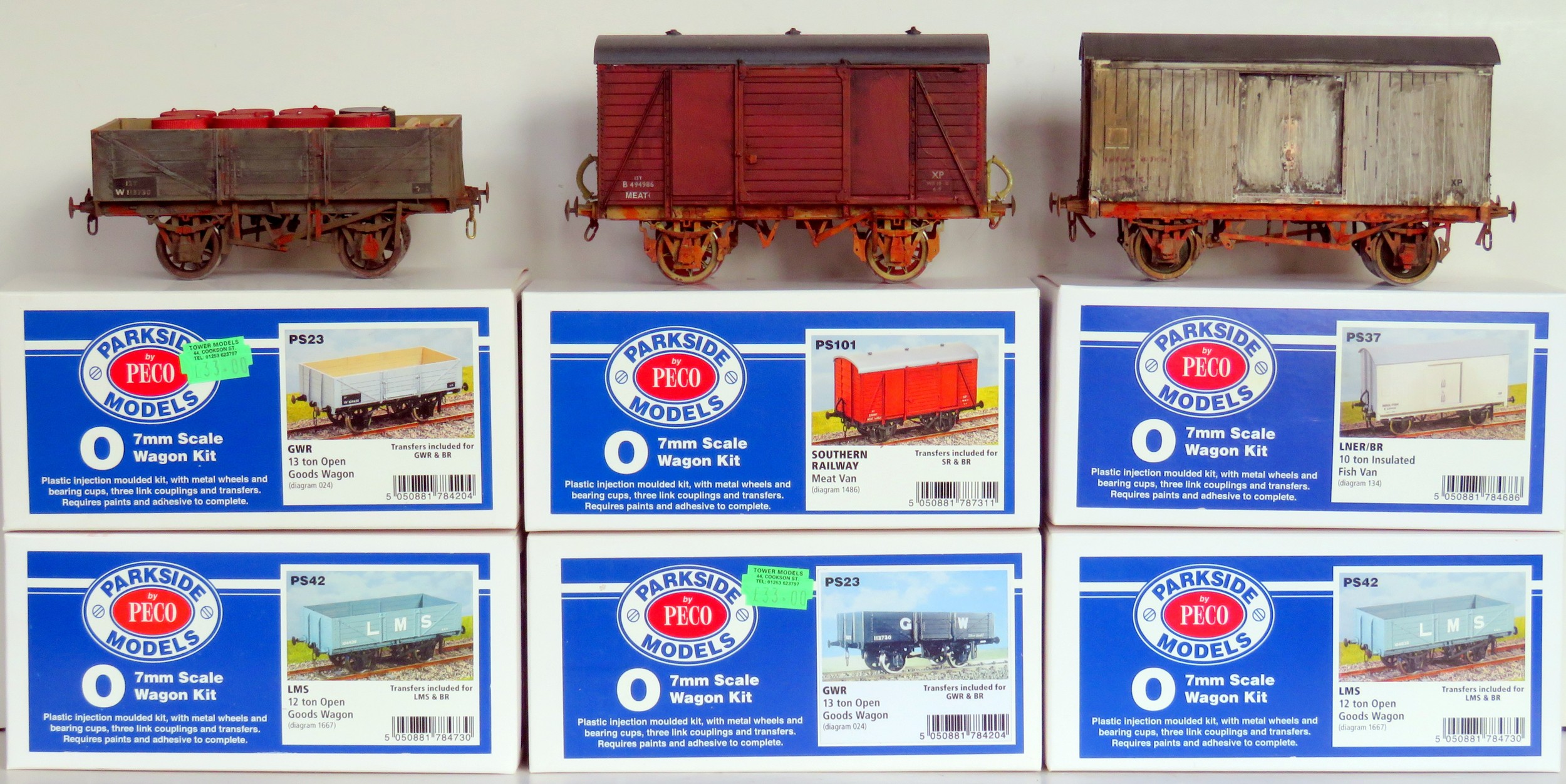 PARKSIDE (by Peco) O Gauge 7mm Scale 6 x Plastic Moulded Wagon Kits with metal wheels, bearing cups and 3-link couplings comprising: PS42 12T Goods Wagon, PS23 13T Goods Wagon, PS42 12T Goods Wagon, PS23 13T Goods Wagon, PS37 10T Fish Van, PS101 Meat Van, all Kits are built, weathered, some with added loads and some applied with alternative livery finishes. Generally Good in Excellent Boxes (6)
