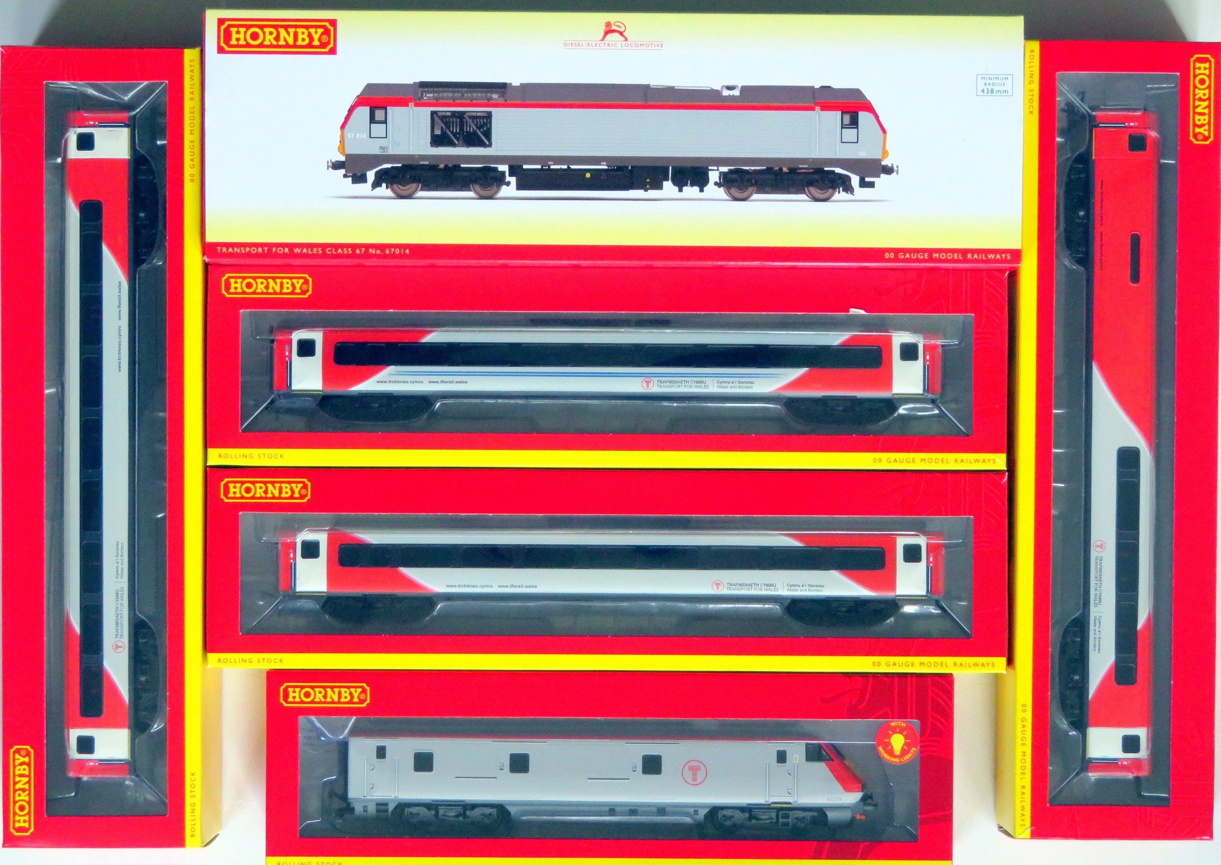 HORNBY (China) 00 Gauge “Transport For Wales” Loco and Rolling Stock comprising: R30089 Class 67 Bo-Bo Loco No. 67014 with directional lighting and Instructions together with 4 x Mk.4 Coaches (R40187 TSO, R40185 FOD, R40194 TSOE, R40189 Buffet) also R40190 Mk.4 DVT with lighting all in TFW livery. All Near Mint in Excellent to Near Mint Boxes (6)