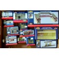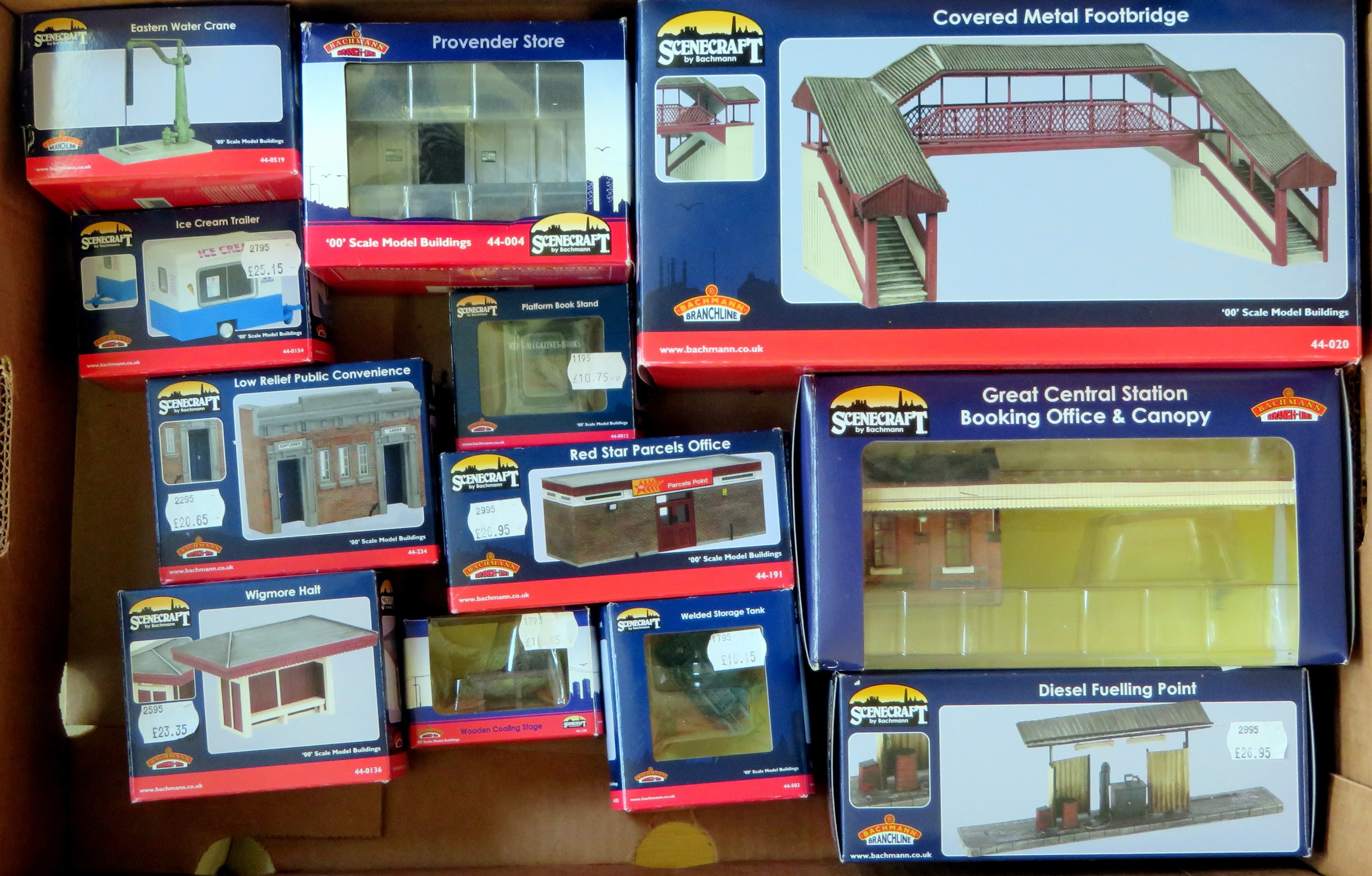 BACHMANN 00 Gauge 12 x Scenecraft Buildings and others comprising: 44-020 Covered Metal Footbridge, 44-117 Great Central Booking Office and Campus, 44-040 Diesel Fuelling Point, 44-004 Provender Store, 44-191 Red Star Parcel Office, 44-0154 Ice Cream Trailer, plus others. Generally Excellent in Good Plus to Excellent Boxes (12)