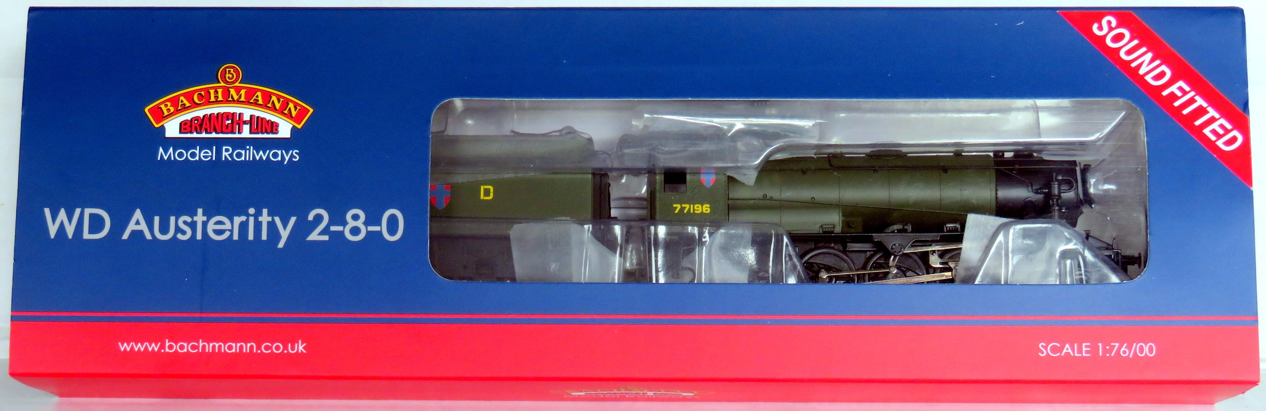 BACHMANN 00 Gauge 32-255BSF Factory Fitted Sound WD Austerity 2-8-0 Loco and Tender No. 77196 Army Transport green “WD and Logo” to Tender sides, with Instructions. Near Mint in Near Mint Box and Outer Sleeve.