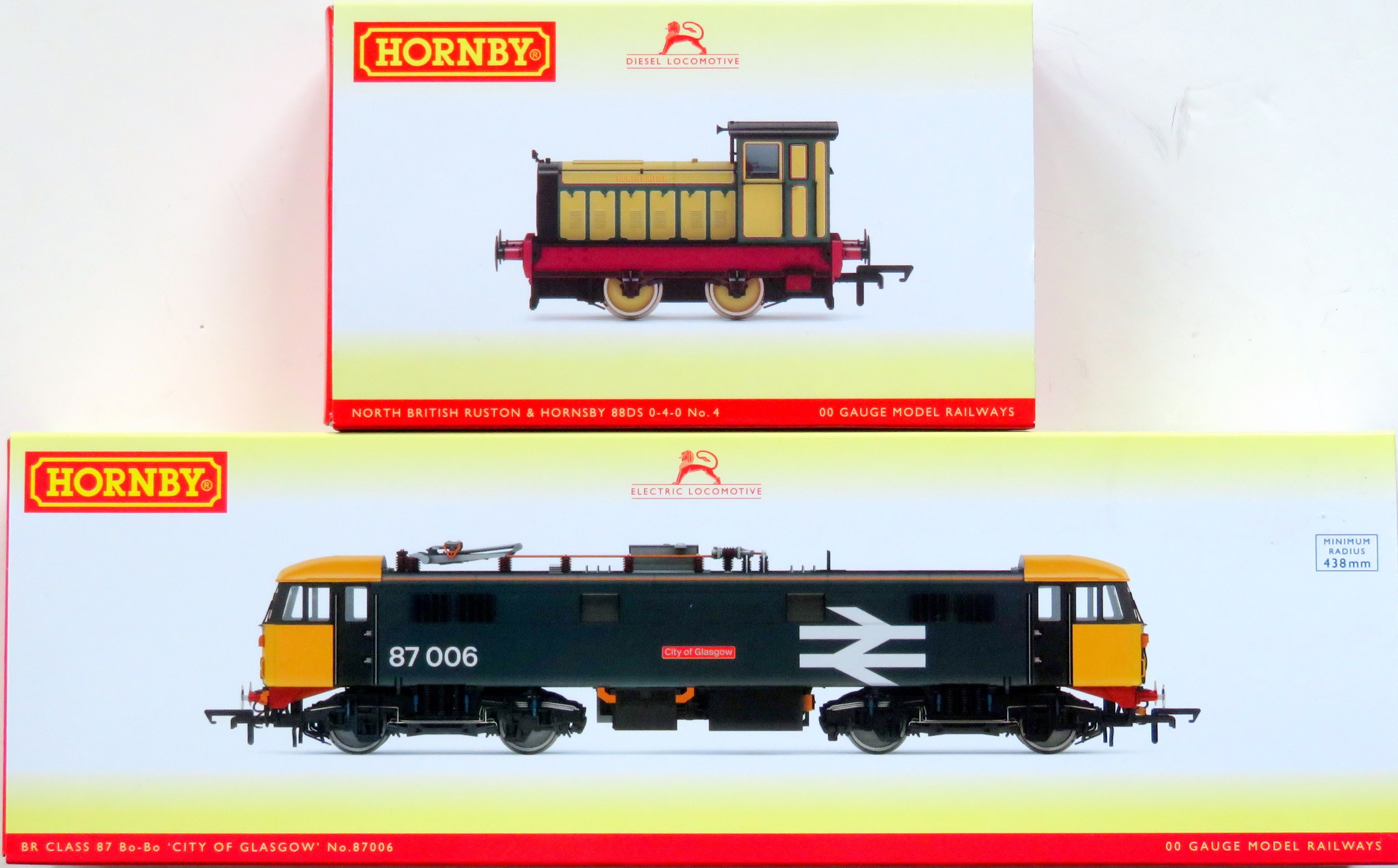 HORNBY (China) 00 Gauge Locos comprising: R30030 Class 87 Bo-Bo Single Pantograph Overhead Electric Loco “City of Glasgow” No. 87006 BR blue, plus R3894 Ruston & Hornsby 88DS 0-4-0 Diesel Loco No. 4 North British livery. Both Near Mint in Excellent to Near Mint Boxes with Picture Outer Sleeves and Instructions (2)