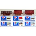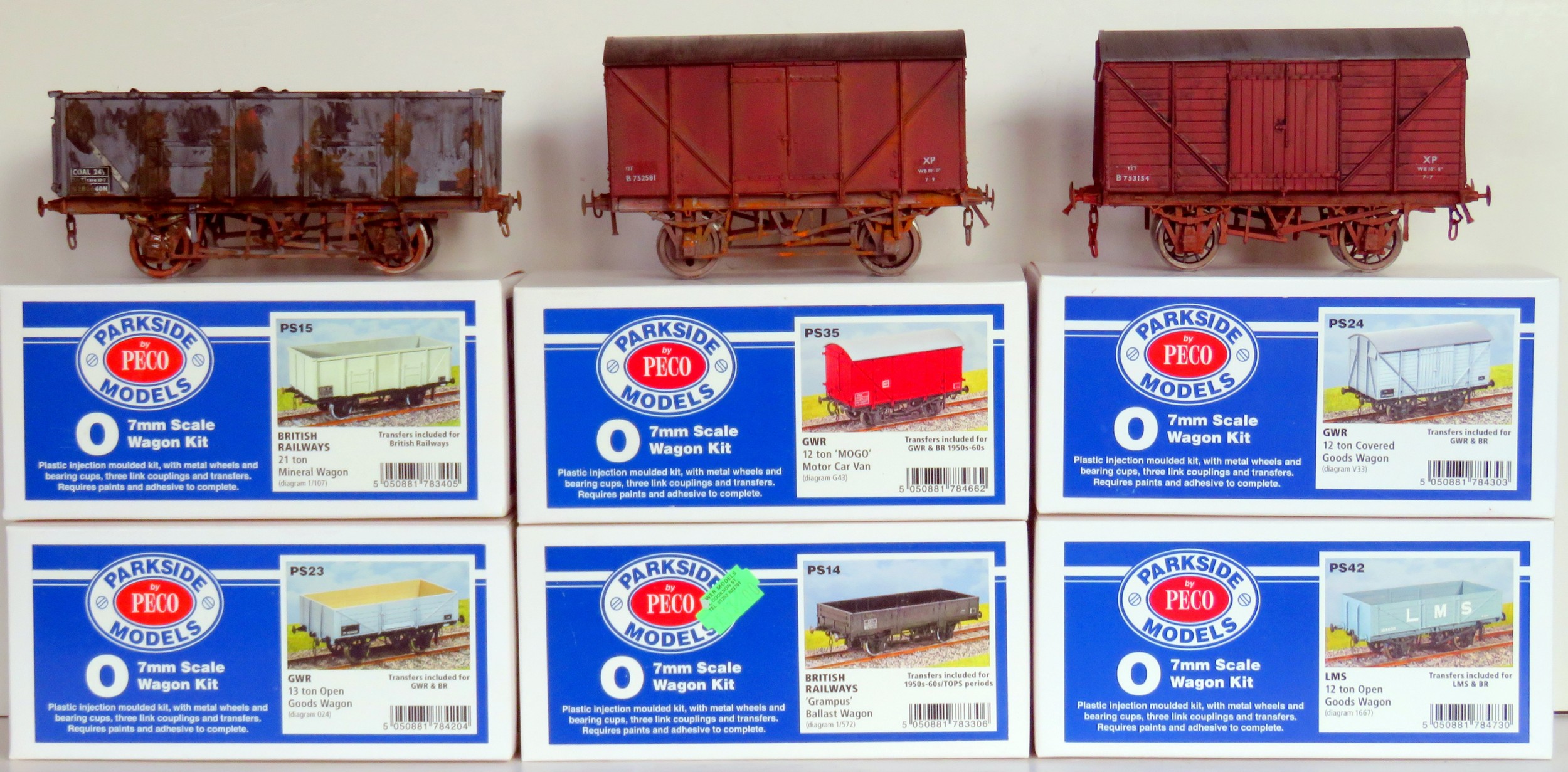 PARKSIDE (by Peco) O Gauge 7mm Scale 6 x Plastic Moulded Wagon Kits with metal wheels, bearing cups and 3-link couplings comprising: PS24 12T Goods Wagon, PS23 13T Goods Wagon, PS14 Ballast Wagon, PS42 12T Goods Wagon, PS15 21T Mineral Wagon, PS35 12T Motor Car Van, all Kits are built, weathered, some with added loads and some applied with alternative livery finishes. Generally Good in Excellent Boxes (6)