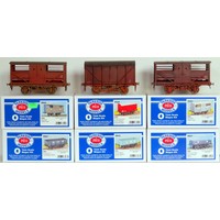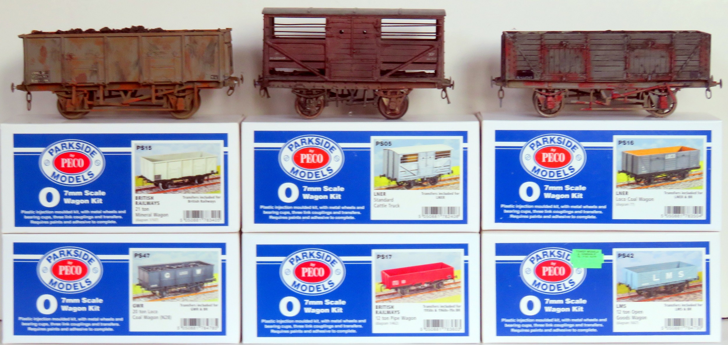 PARKSIDE (by Peco) O Gauge 7mm Scale 6 x Plastic Moulded Wagon Kits with metal wheels, bearing cups and 3-link couplings comprising: PS16 Coal Wagon, PS47 20T Coal Wagon, PS17 12T Pipe Wagon, PS42 12T Goods Wagon, PS15 21T Mineral Wagon, PS05 Cattle Truck, all Kits are built, weathered, some with added loads and some applied with alternative livery finishes. Generally Good in Excellent Boxes (6)