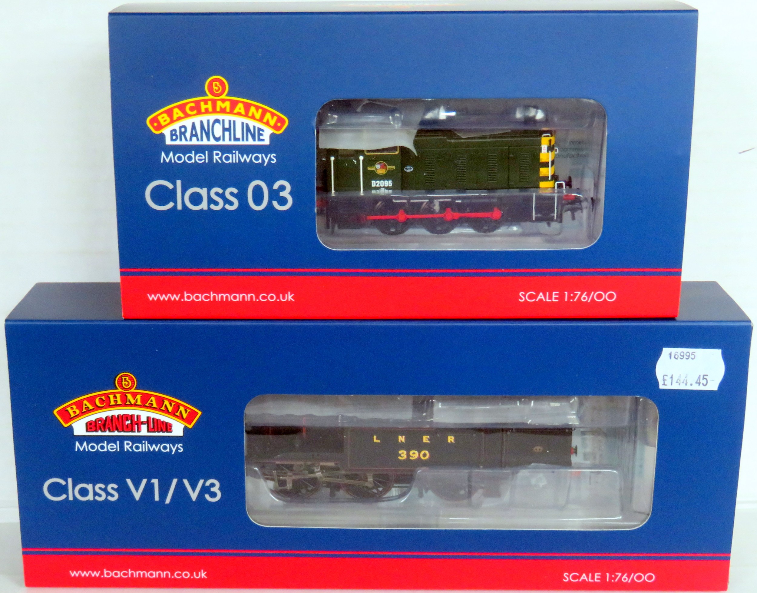 BACHMANN 00 Gauge Locos comprising: 31-617 Class V1/V3 2-6-2 Tank Loco No. 390 LNER black, plus 31-364A Class 03 0-6-0 Diesel Loco No. D2095 BR green with wasp stripes. Both with Accessory Packs and Instructions. Near Mint in Near Mint Boxes and Outer Sleeves (2)