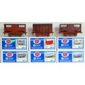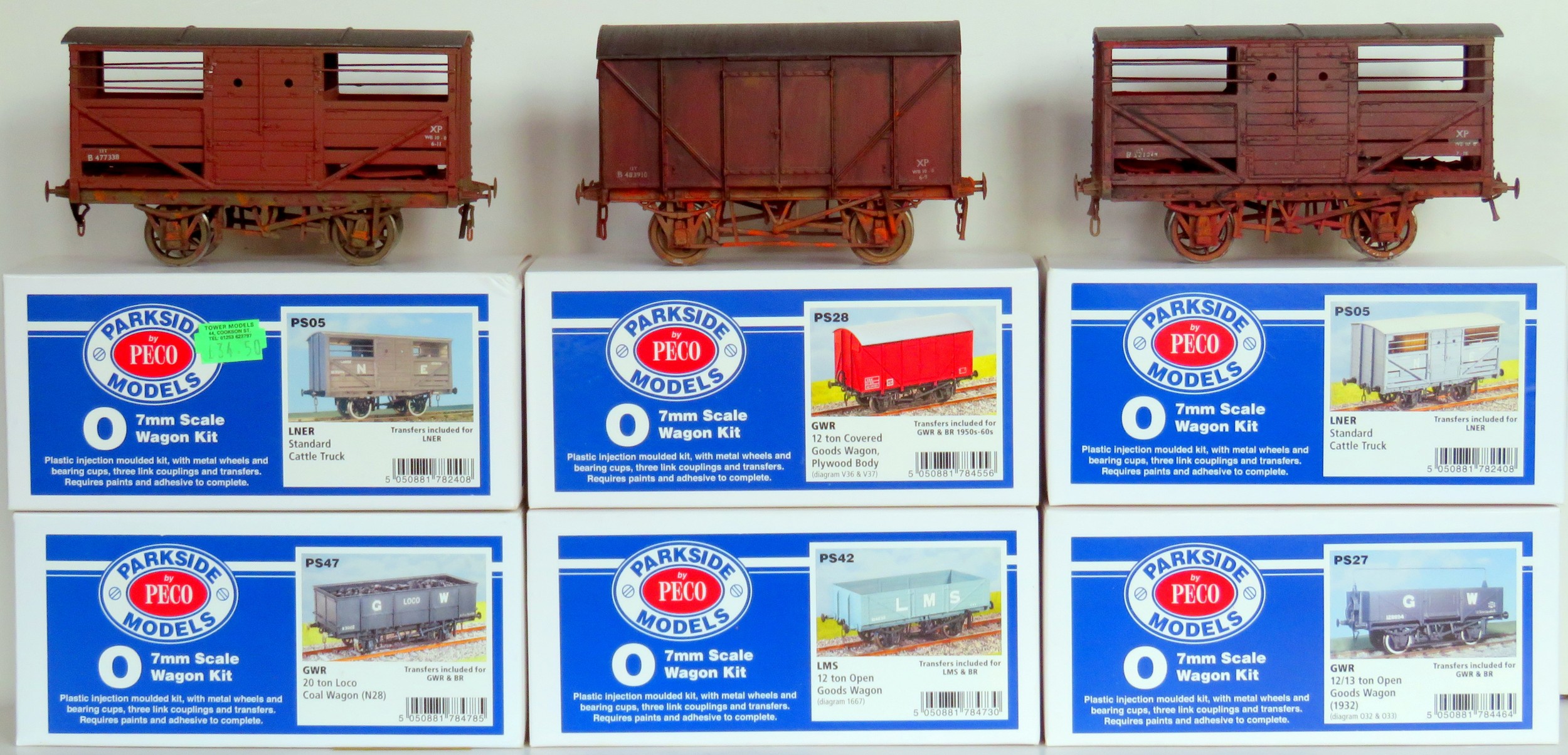 PARKSIDE (by Peco) O Gauge 7mm Scale 6 x Plastic Moulded Wagon Kits with metal wheels, bearing cups and 3-link couplings comprising: PS27 12/13T Goods Wagon, PS42 12T Goods Wagon, PS47 20T Coal Wagon, PS05 Cattle Truck, PS28 12T Goods Wagon, PS05 Cattle Truck, all Kits are built, weathered, some with added loads and some applied with alternative livery finishes. Generally Good in Excellent Boxes (6)