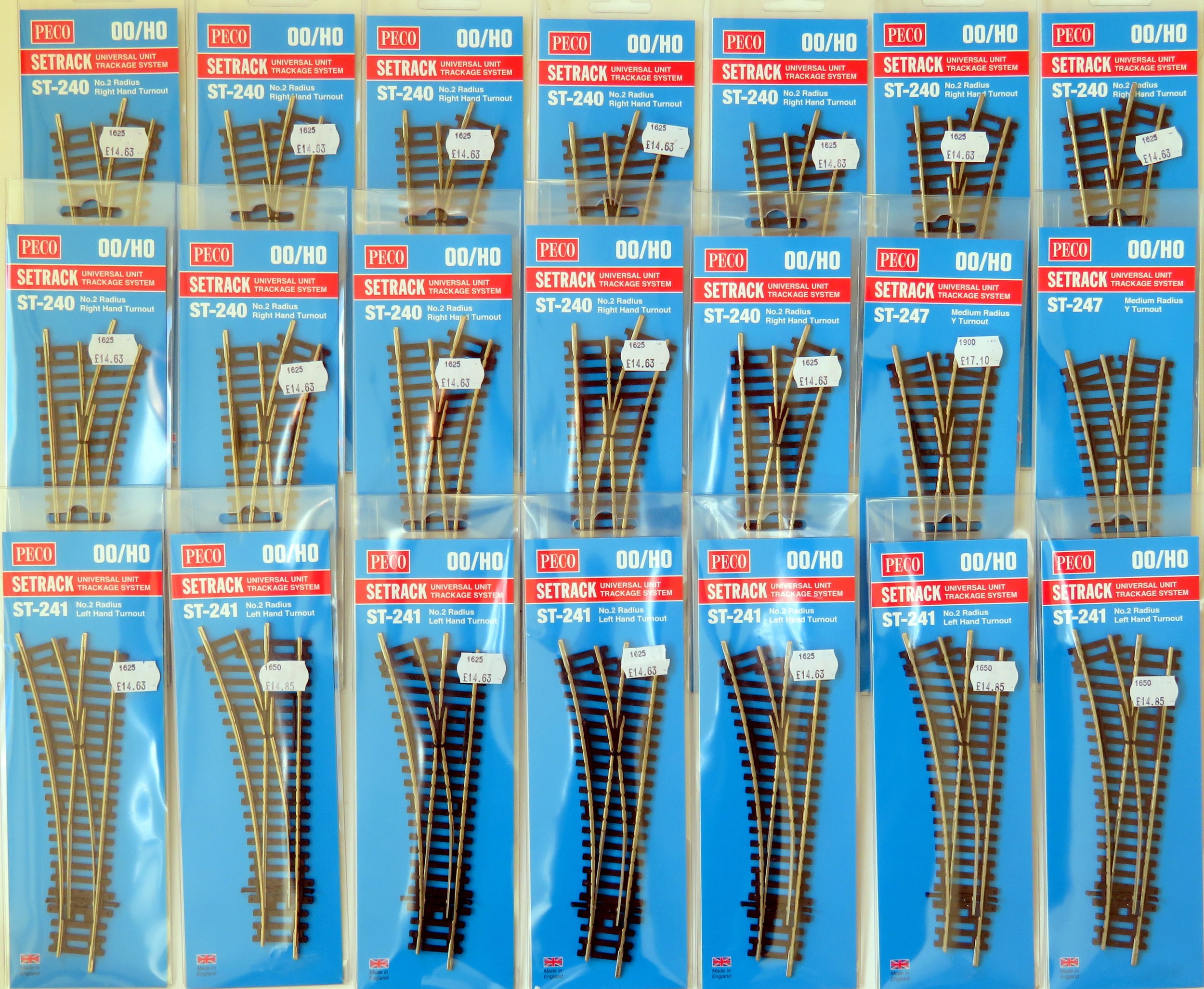 PECO 00 Gauge 21 x Insulfrog Points comprising: 12 x ST-240 No. 2 Radius R/H, 7 x ST-241 No. 2 Radius L/H, 2 x ST-247 Medium Radius Y. All in unopened Packs (21)