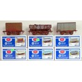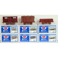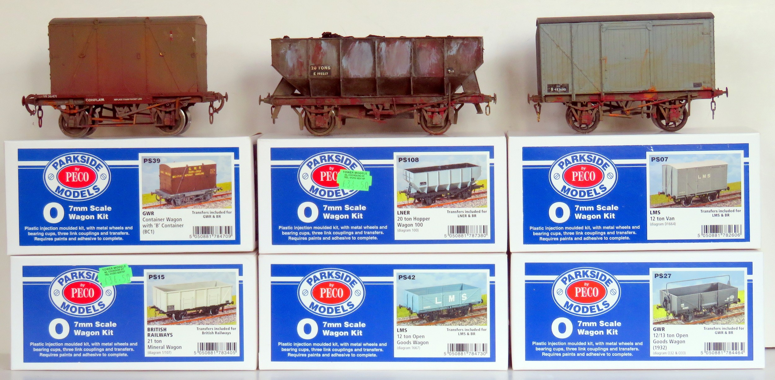 PARKSIDE (by Peco) O Gauge 7mm Scale 6 x Plastic Moulded Wagon Kits with metal wheels, bearing cups and 3-link couplings comprising: PS27 12/13T Goods Wagon, PS42 12T Goods Wagon, PS15 21T Mineral Wagon, PS07 12T Van, PS108 20T Hopper Wagon, PS39 Container Wagon with Container, all Kits are built, weathered, some with added loads and some applied with alternative livery finishes. Generally Good in Excellent Boxes (6)