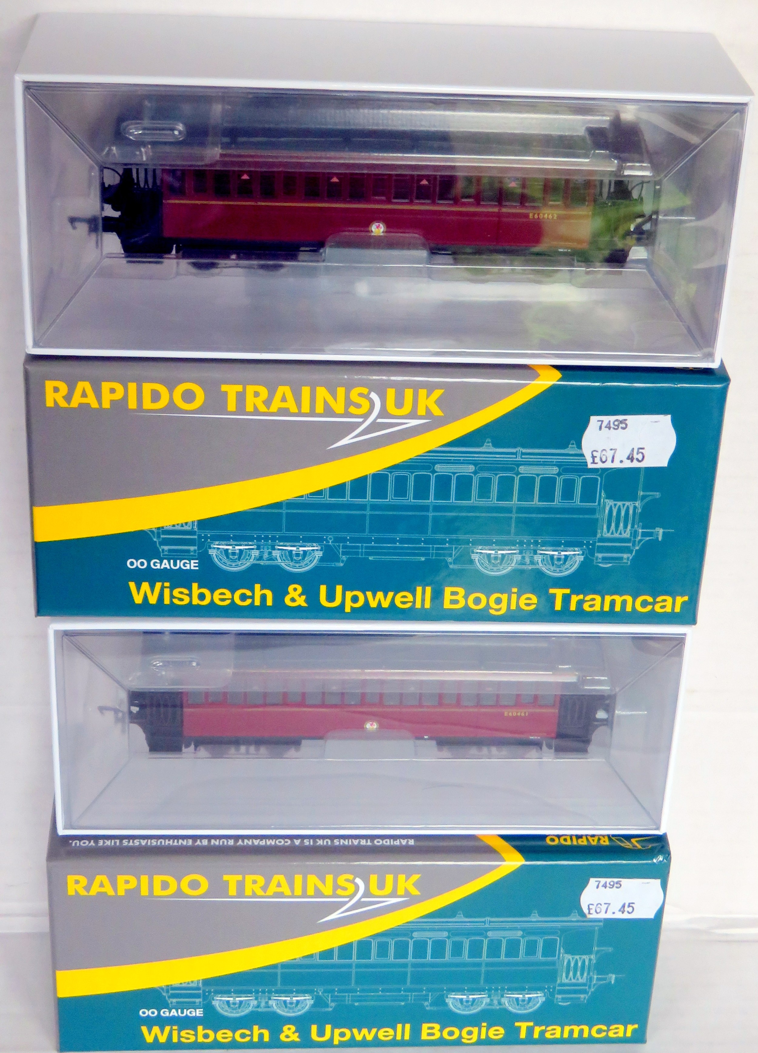 RAPIDO TRAINS 00 Gauge 2 x Wisbech & Upwell Bogie Tramcars BR lined crimson (1 x 919006 No. E60461 3rd Class, 1 x 919007 No. E60462 Composite/Buffet). Both Near Mint in Near Mint Boxes (2)