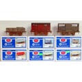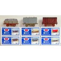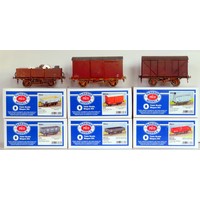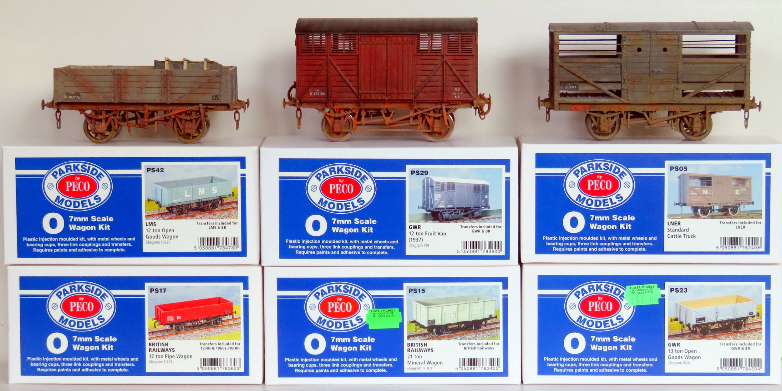 PARKSIDE (by Peco) O Gauge 7mm Scale 6 x Plastic Moulded Wagon Kits with metal wheels, bearing cups and 3-link couplings comprising: PS05 Cattle Truck, PS17 12T Pipe Wagon, PS15 21T Mineral Wagon, PS23 13T Goods Wagon, PS42 12T Goods Wagon, PS29 12T Fruit Van, all Kits are built, weathered, some with added loads and some applied with alternative livery finishes. Generally Good in Excellent Boxes (6)