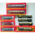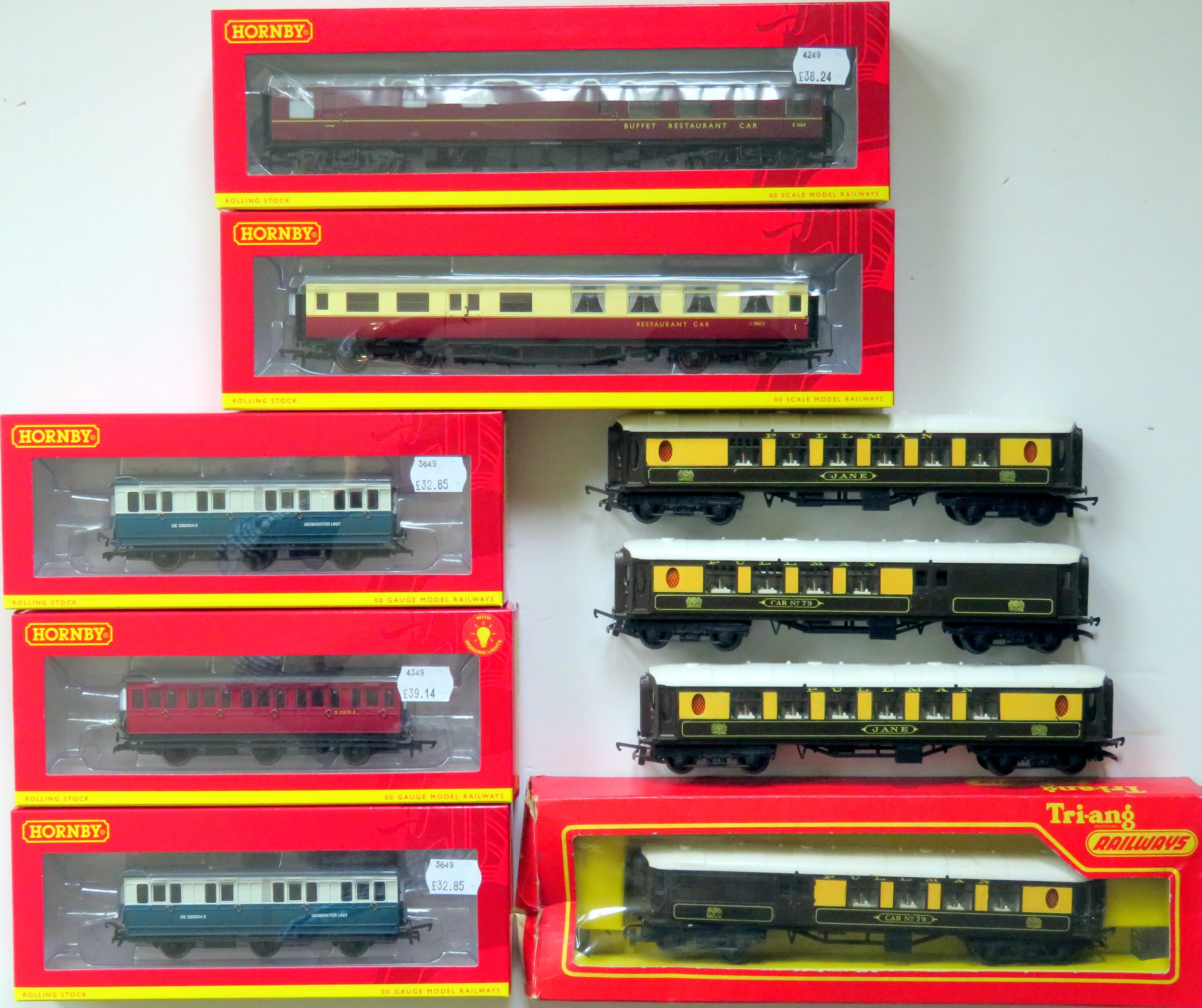 HORNBY (China) / TRIANG 00 Gauge 9 x Coaches comprising: Hornby R40029A BR Maunsell 1st Class RK Coach No. S7880S (Restaurant Car) crimson and cream, R40026 BR/ER Mk.1 Restaurant/Buffet Coach No. E1664 BR maroon, R40124 BR 3rd Class 6-wheel Coach No. E31070E with lights, 2 x R40328 BR Intercity 6-wheel Generator Coaches No. DE3204E BR blue and grey. All Near Mint in Near Mint Boxes, also included 4 x Triang brown and cream Pullman Cars, Generally Good (1 Boxed) (9)