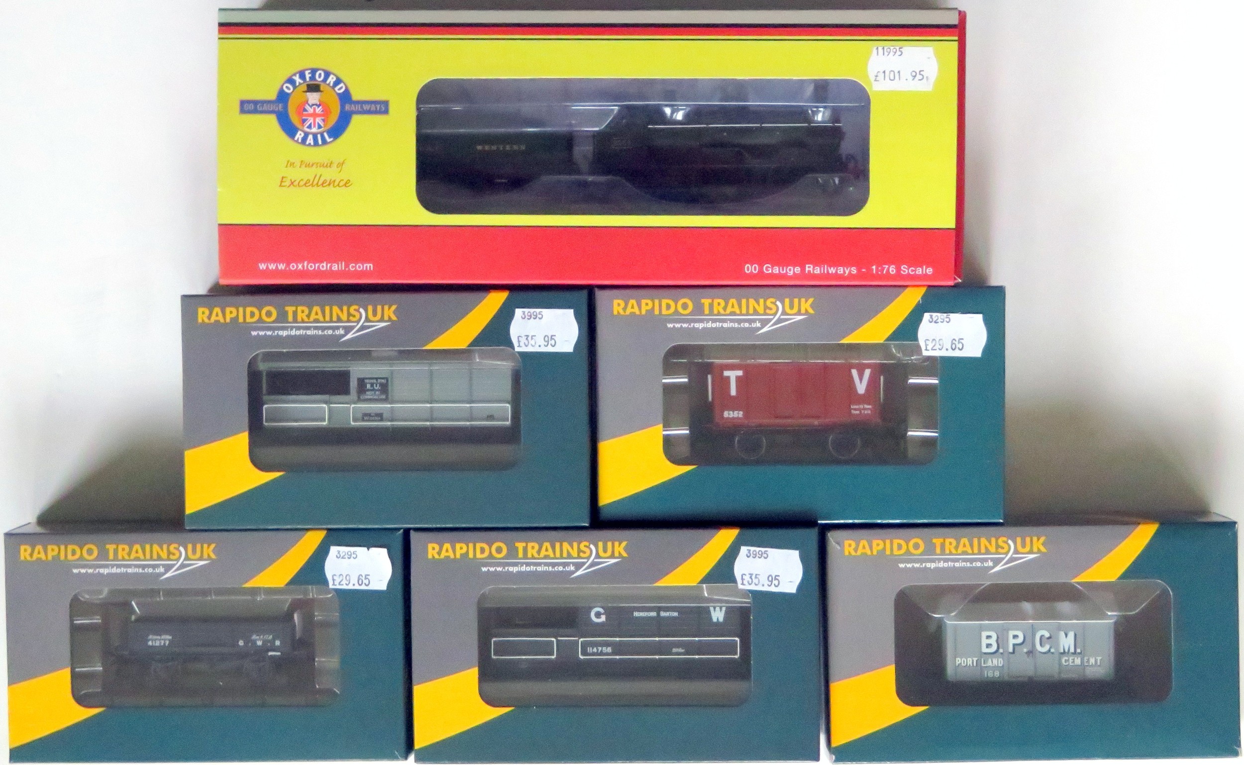 RAPIDO TRAINS / OXFORD RAIL 00 Gauge Loco and Rolling Stock comprising: Oxford Rail OR76DG005 Dean Goods 0-6-0 Loco and Tender No. 2534 GWR green. Excellent in Excellent Box and Outer Sleeve plus Rapido Trains 918001 AA20 Toad Brake Hereford Barton GW grey, 90807 Iron Mink BPCM grey, 908025 Iron Mink Taff Vale Railway metal-bodied Van, 925002 GWR 4-Plank GWR grey, 91808 AA20 Toad Brake Yeovil Pen Mill RU BR grey. All Near Mint in Near Mint Boxes (6)