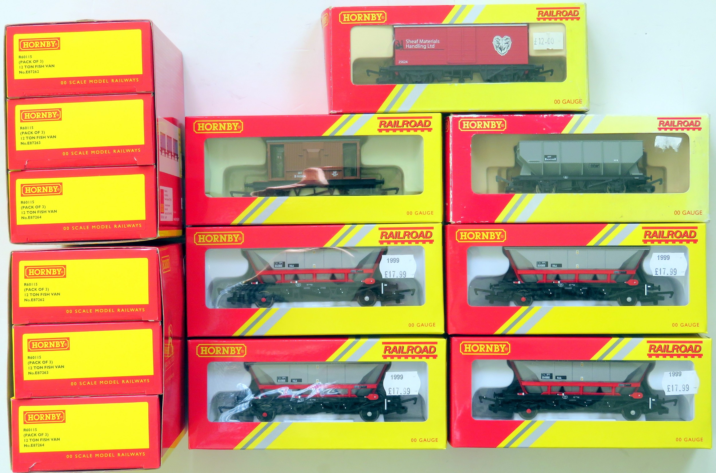 HORNBY (China) 00 Gauge Goods Wagons comprising: Hornby 2 x R60115 (3-Wagons Sets) BR blue 12T Fish Vans, Hornby Railroad 4 x R60266 BR Railfreight MGR Hopper Wagons, R6474 l.w.b. Box Van, plus others. Good to Near Mint in Good to Near Mint Boxes (13 Wagons)
