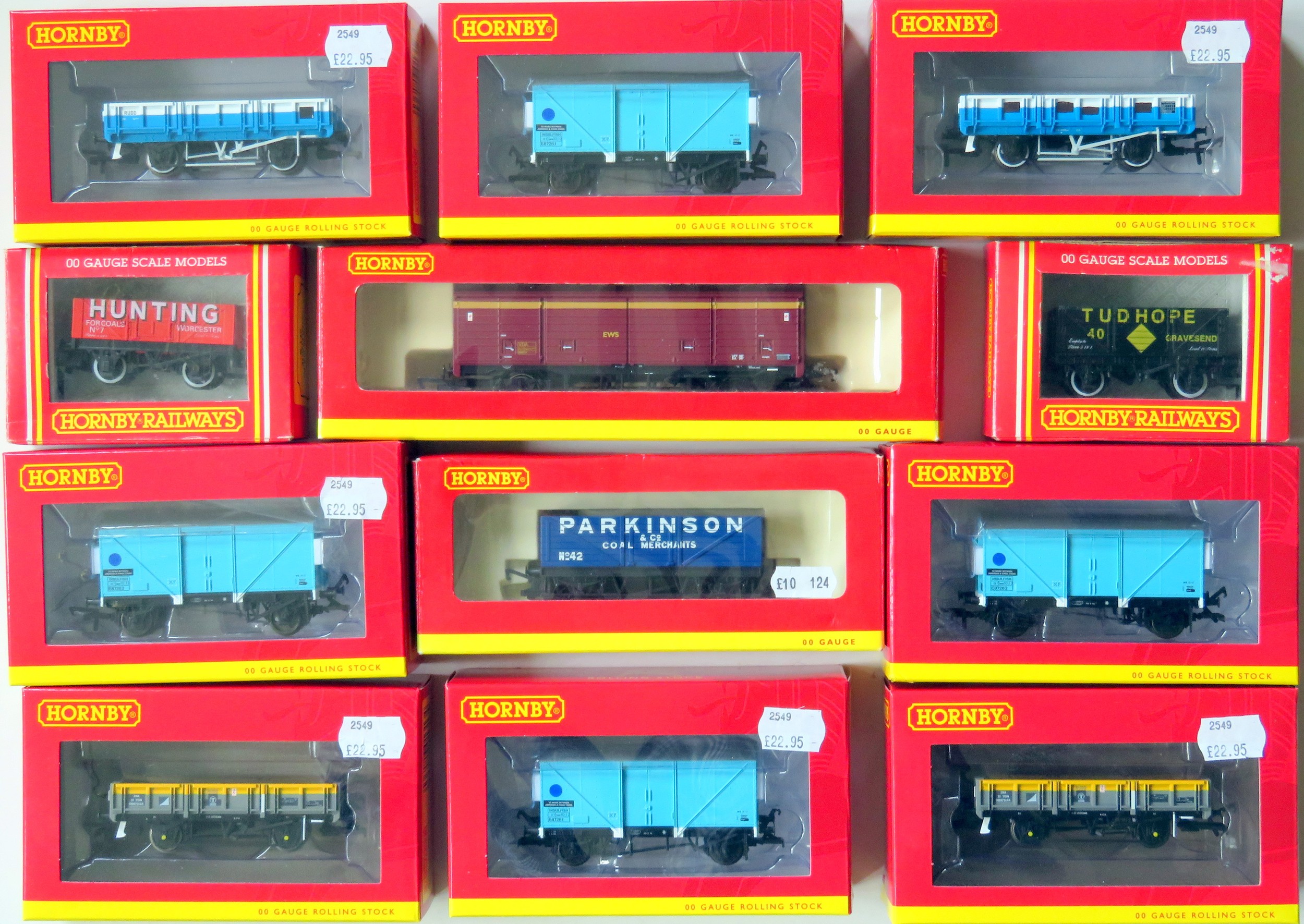HORNBY 00 Gauge 12 x Goods Wagons to include: 4 x R60114 BR Blue Spot 12T Fish Vans, 2 x R60223 Ex. Balfour Beatty ZBA Rudd, 2 x R60222 Departmental ZBA Rudd plus others. Good to Near Mint in Good to Near Mint Boxes (12)